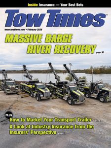 The Tow Times February issue addresses industry insurance topics including perspectives from industry insurer’s, how to build an efficient and cost-effective policy, and how captive insurance can be a strategic asset. We also cover how to market transport trailers, and how to be compliant when towing for law enforcement. In our Recovery Review department, operators from Interstate Towing of Chicopee, MA, put four of their rotators to work to recover a partially-sunken barge from the Hudson River. Find all this and more in the Tow Times February issue.