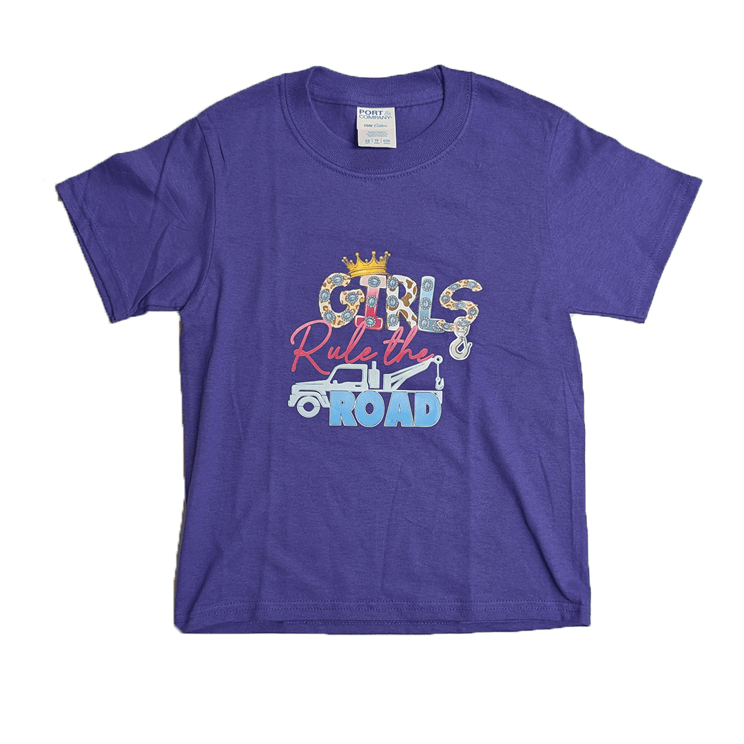 A children’s purple t-shirt with a Girls Rule the Road graphic.